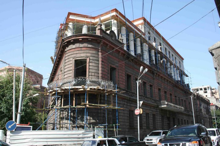 Since then it has undergone a number of changes throughout its history, notably a complete renovation and restoration in the 1980s where a much more successful reconstruction was made. But in 2006 the government allocated the building to the prominent diasporan benefactor Hrayr Hovnanian, who ordered a ‘renovation’ and expansion of the building from the architect Hrachia Poghosian. Although the building is on the state heritage preservation list and according to the law it should not have been tempered with in any form, the architect’s design has doubled the existing volume of the structure with the addition of two extra storeys built out of concrete blocks and in a style completely anthitetical to the original structure. In order to achive this, the entire interior of the historic building, including some original tilework and the iron staircase were gutted out. While cases of such blatant architectural disjuncture between ‘old’ and ‘new’ exist in many Western cities – where historic buildings are given to redevelopment – the style of the new addition with its heavy and pompously decorative classicism is incredibly jarring as it competes with the noble, sombre and very strict forms of the original building.